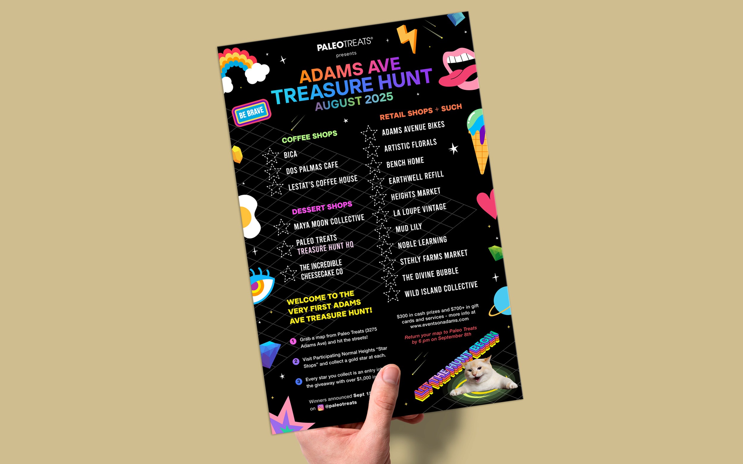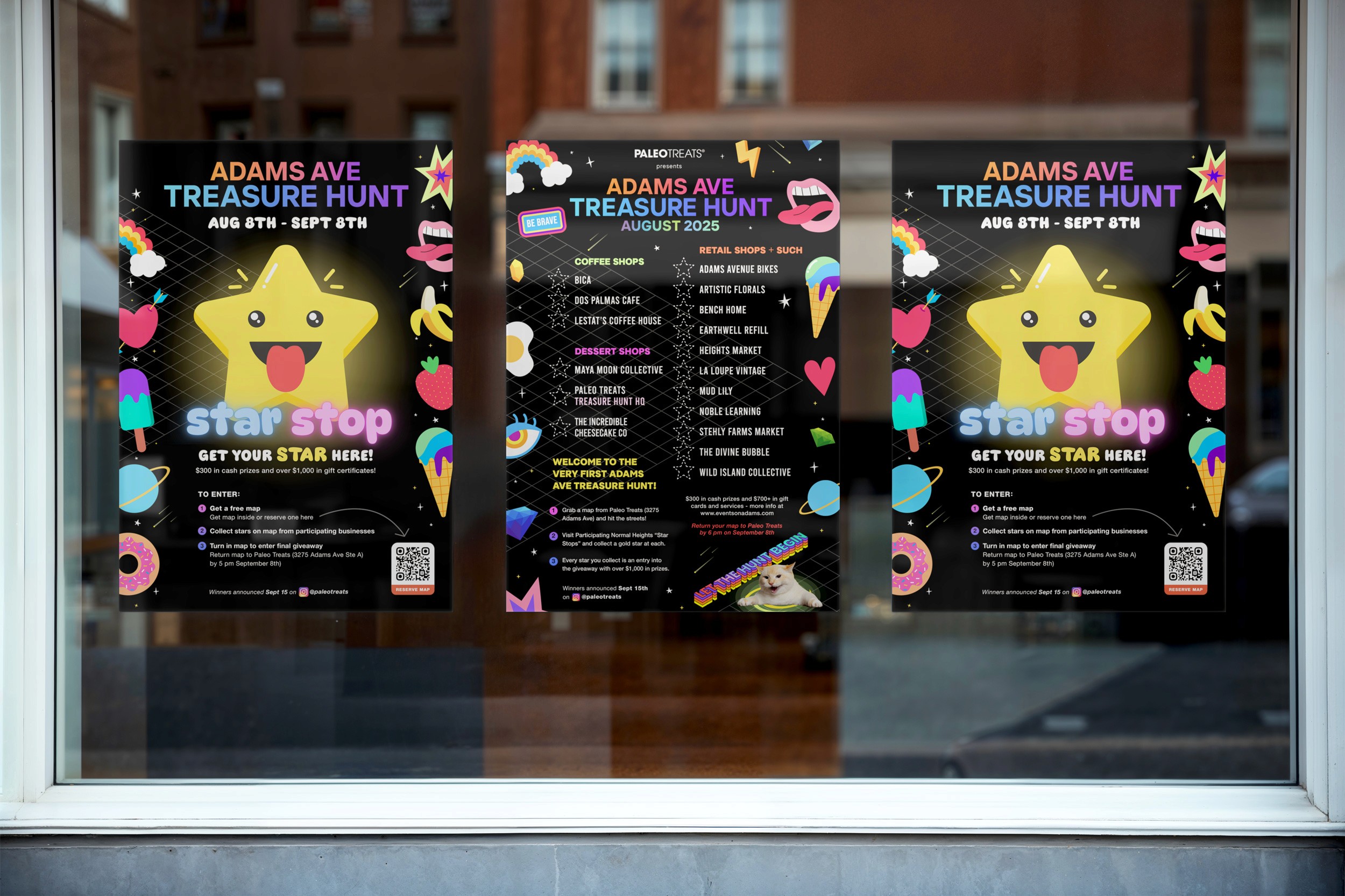 I created the visual identity and promotional assets for the first-ever Adams Ave Treasure Hunt, a community-driven event in San Diego’s Normal Heights neighborhood. My role included designing the treasure map, “Star Stop” window posters for participating local businesses, a limited-edition event mug, and a dynamic Instagram Reel to drive engagement and participation.
